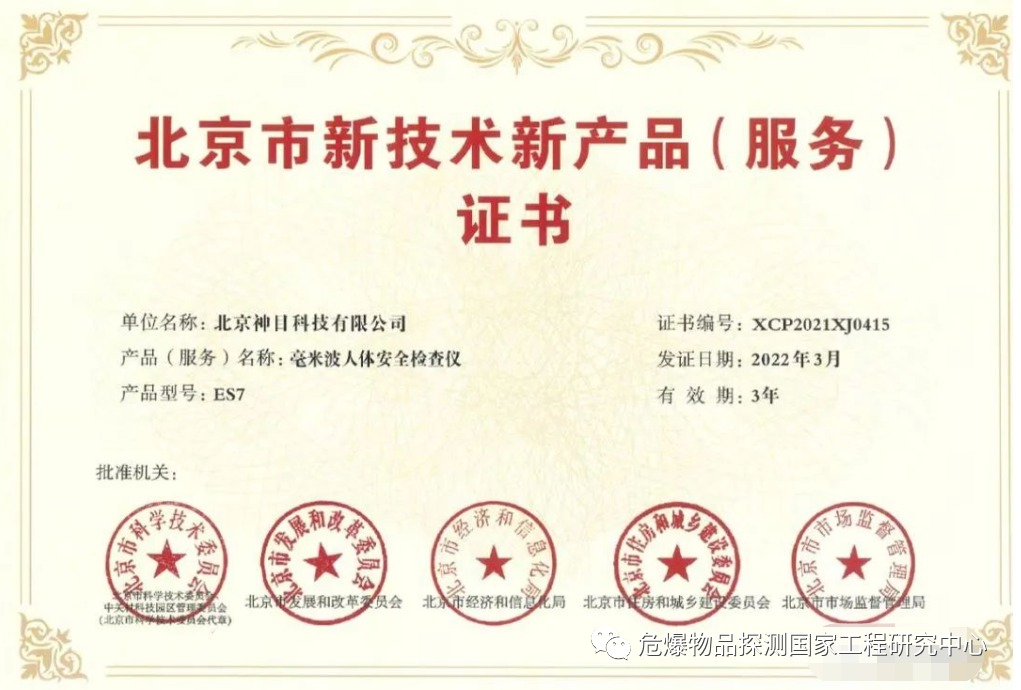 2022年,ES7毫米波人体安全检查仪获得北京市新技术新产品(服务)证书。北京市新技术新产品(服务)证书具有极高的权威性,该认定旨在推动新技术新产品(服务)的推广应用,发展和扶持具有技术先进性和创新性、具有成熟技术可靠质量、以及符合构建“高精尖”经济结构要求的产品或服务。